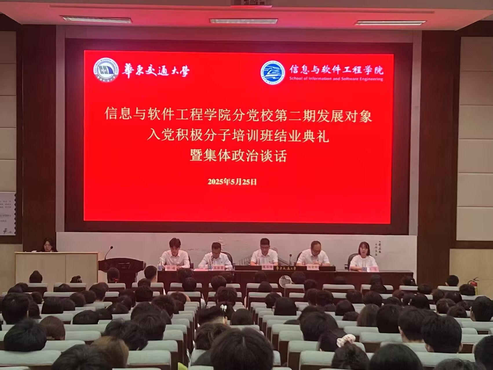于南区图书馆202举行第二期发展对象、入党积极分子培训班结业典礼暨集体政治谈话。学院党委书记、分党校校长魏永峰,党委副书记、分党校副校长冯荣刚出席典礼,院党委委员、党委组织员、培训班班主任王业贵主持,院党委组织员、创新创业学生党支部书记黄芳,院党委兼职组织员、软件第一学生党支部书记刘通,发展对象及入党积极分子全体学员参加。