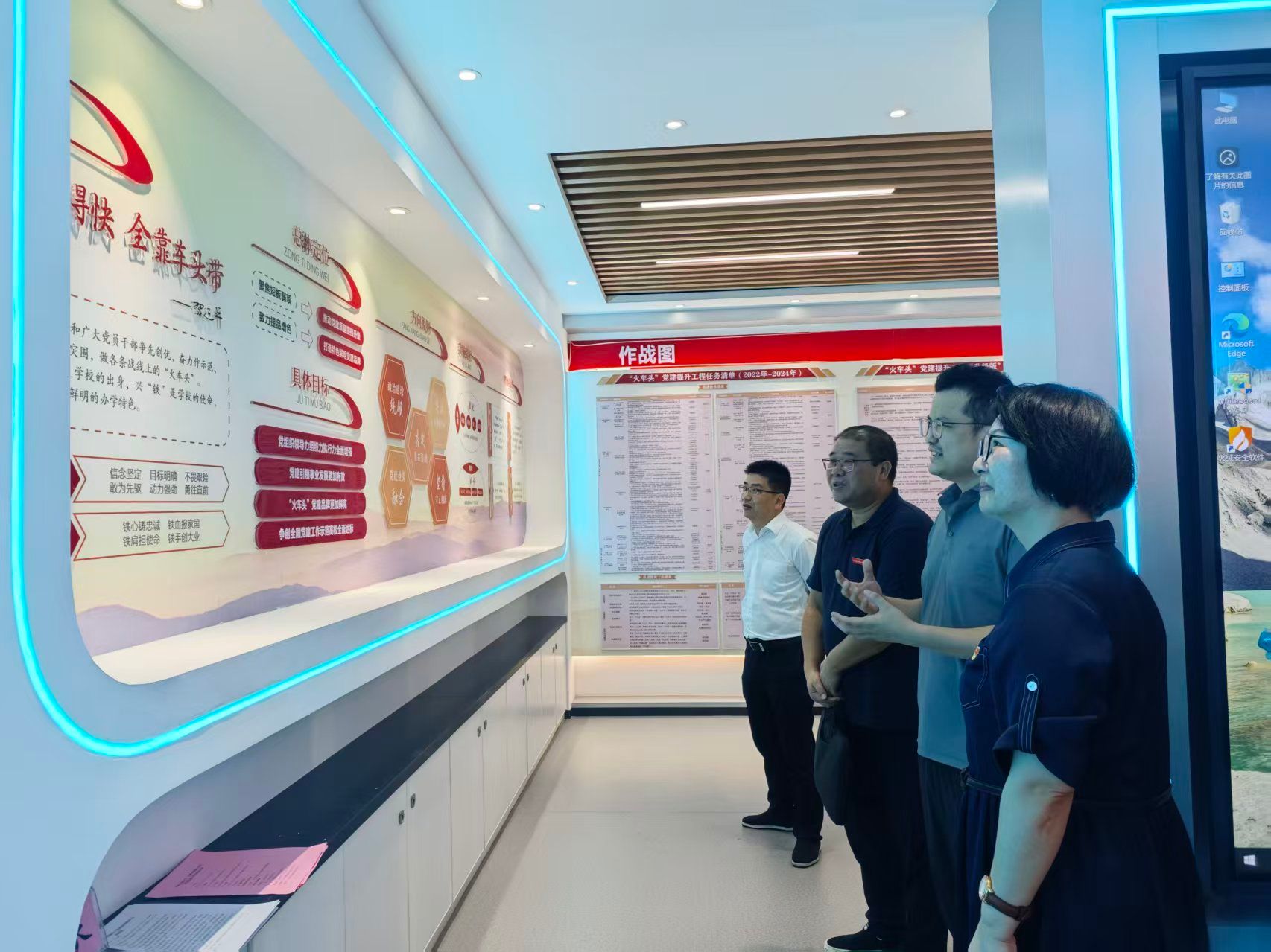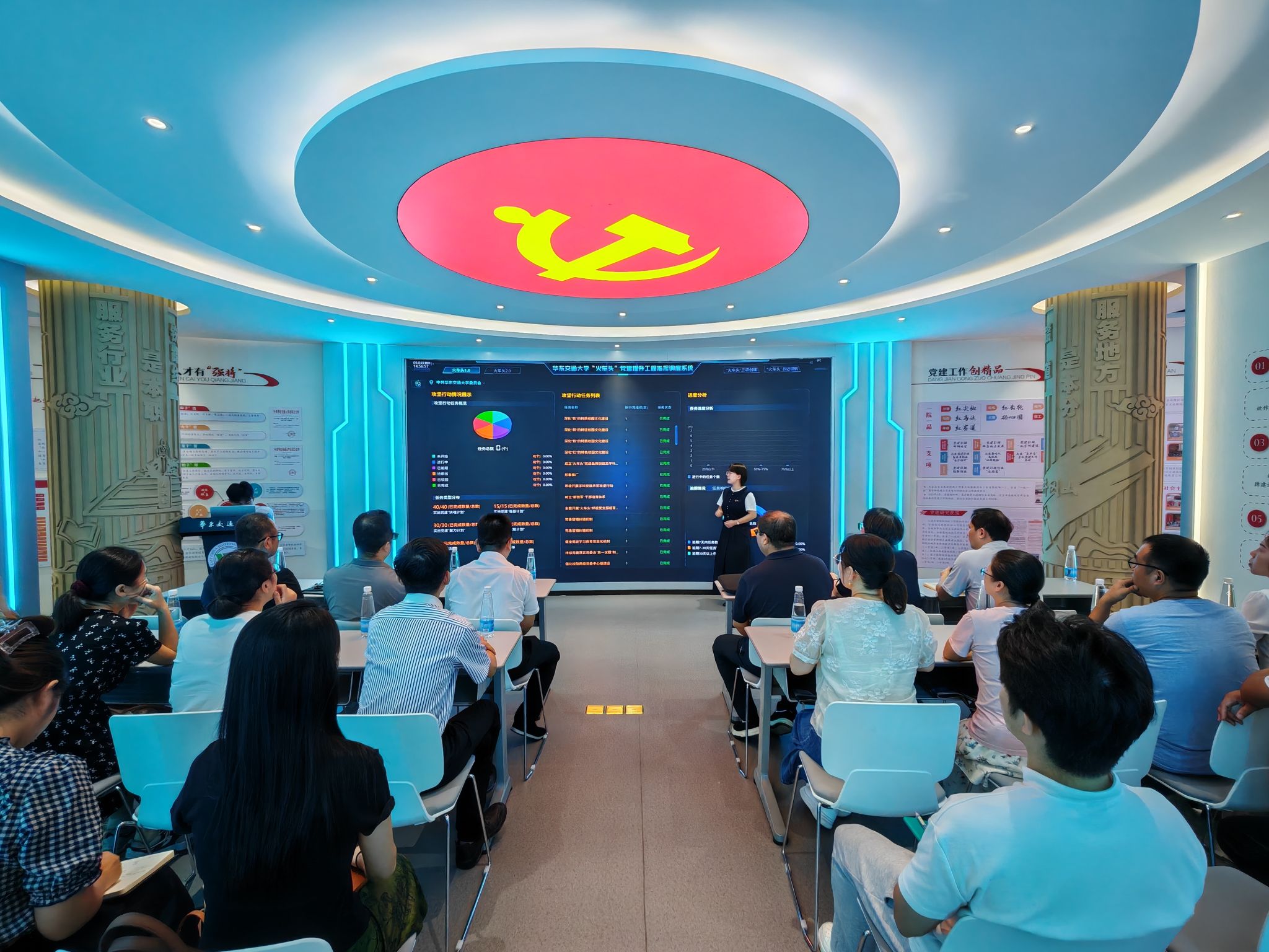 “火车头”党建提升工程指挥调度中心。王巍详细介绍了学校“火车头”党建品牌的创建背景、主要做法及成效,并围绕推动党建与学校事业深度融合等方面进行了交流探讨。