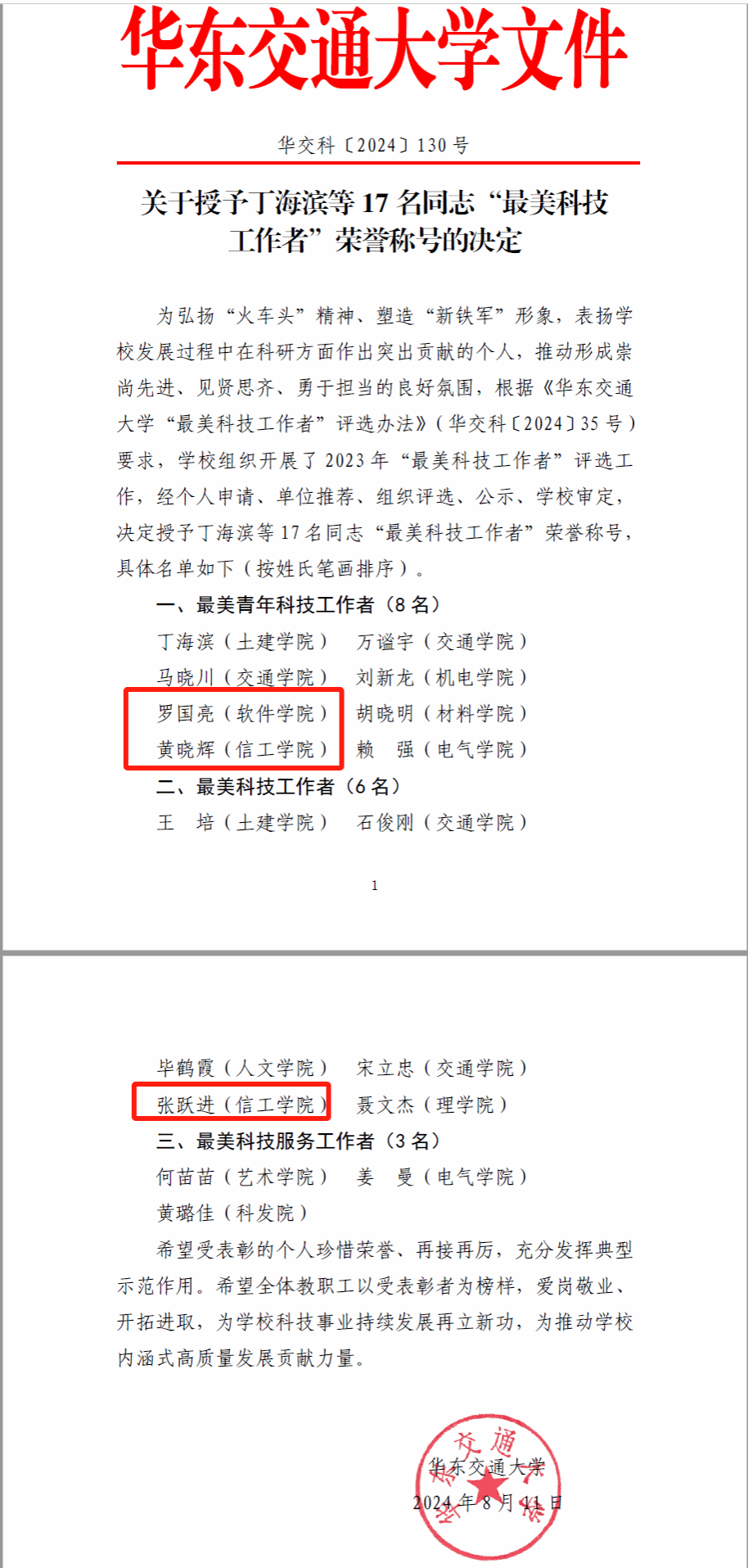 教师罗国亮、黄晓辉荣获“最美青年科技工作者”称号(全校仅8名),张跃进荣获“最美科技工作者”称号(全校仅6名)。
