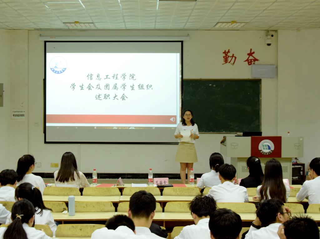 6月8日,信息工程学院团学组织述职报告大会于图书馆101室成功召开。信息工程学院学工办副主任兼团委副书记艾国金、杨青出席会议,信息学院学生会及团属学生组织全体成员与会。