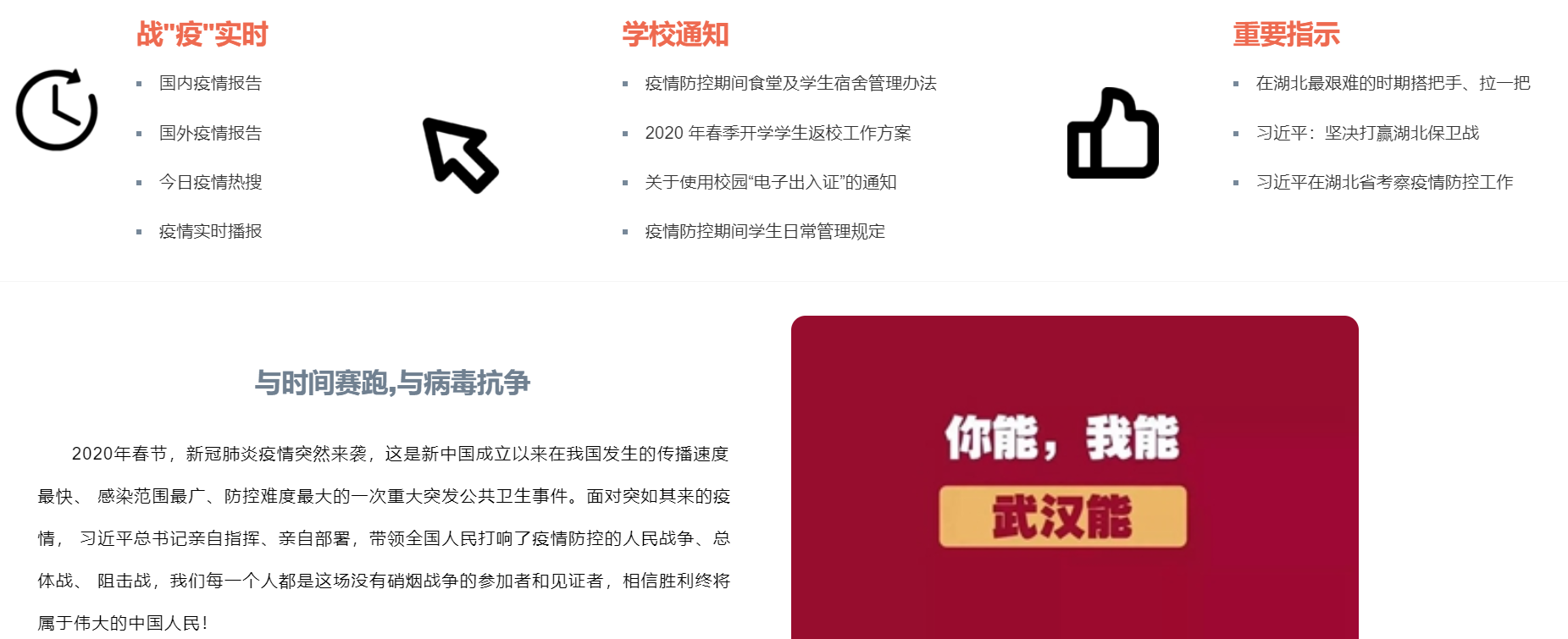 会上,班长刘军东详细介绍了网站的各个模块,内容包括国家重要指示、战“疫”实时新闻、学校相关通知、抗“疫”小常识和视频以及多位老师的寄语。刘军东带领同学们认真学习了习近平总书记关于疫情防控的重要讲话和党中央决策部署,以及对学校相关防疫文件进行详细说明。
