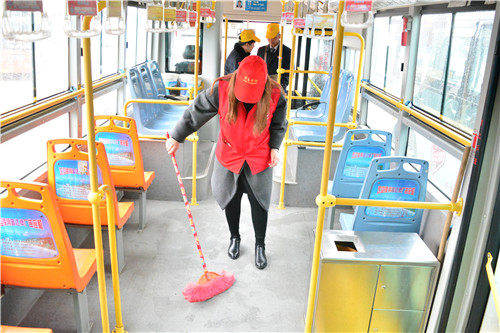 志愿者自发清扫公交车卫生