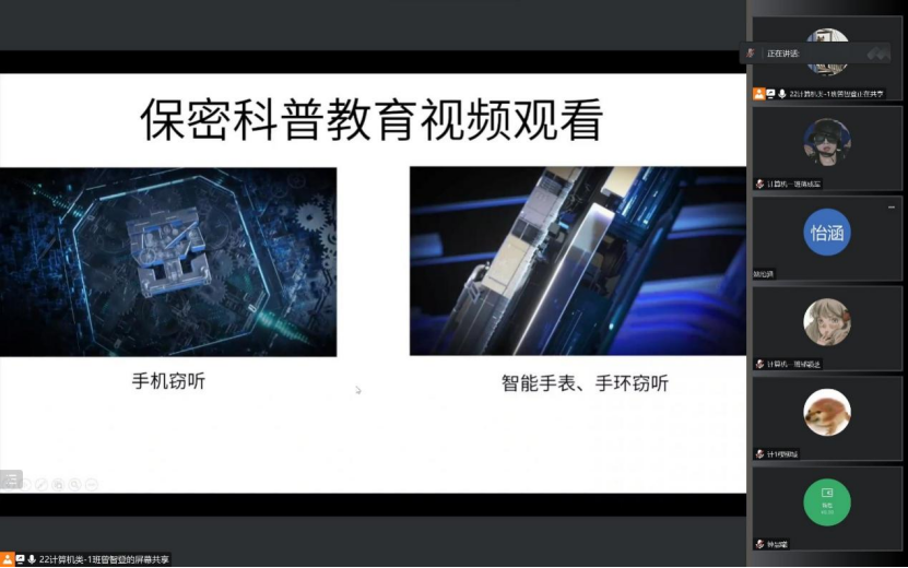 为进一步增强全员保密意识和国家安全意识,自觉履行保守国家秘密和维护国家安全的义务,信息学院各团支部在“五四”青年节期间开展线下线上相结合的保密主题团日活动。各团支书从什么是保密、开展保密教育的意义、怎样做好安全保密工作三方面做了详细介绍,组织支部全体团员共同观看2023年保密公益宣传片,通过观看短视频的方式从保密科普教育和保密传统教育两方面深入学习安全保密知识。