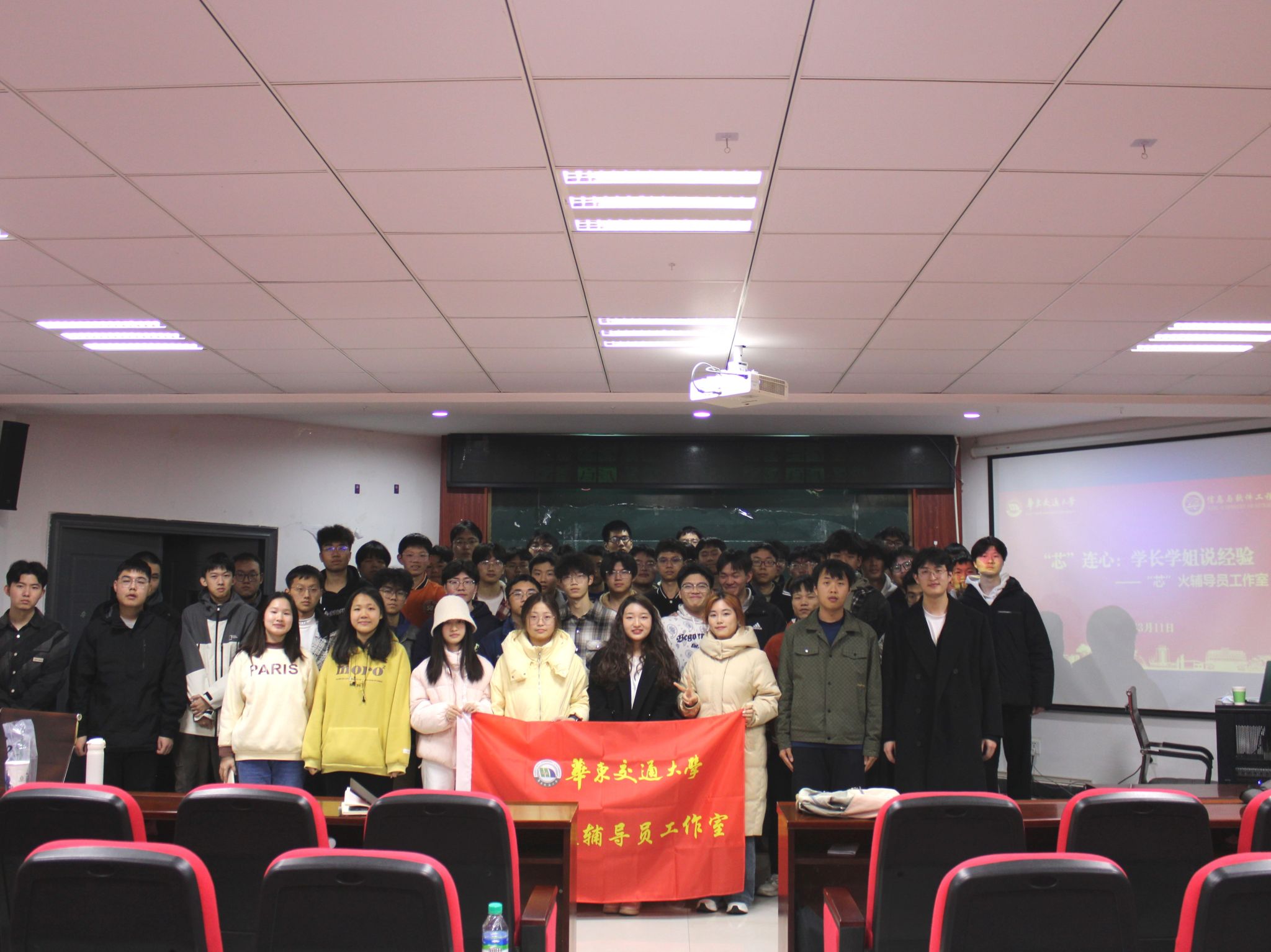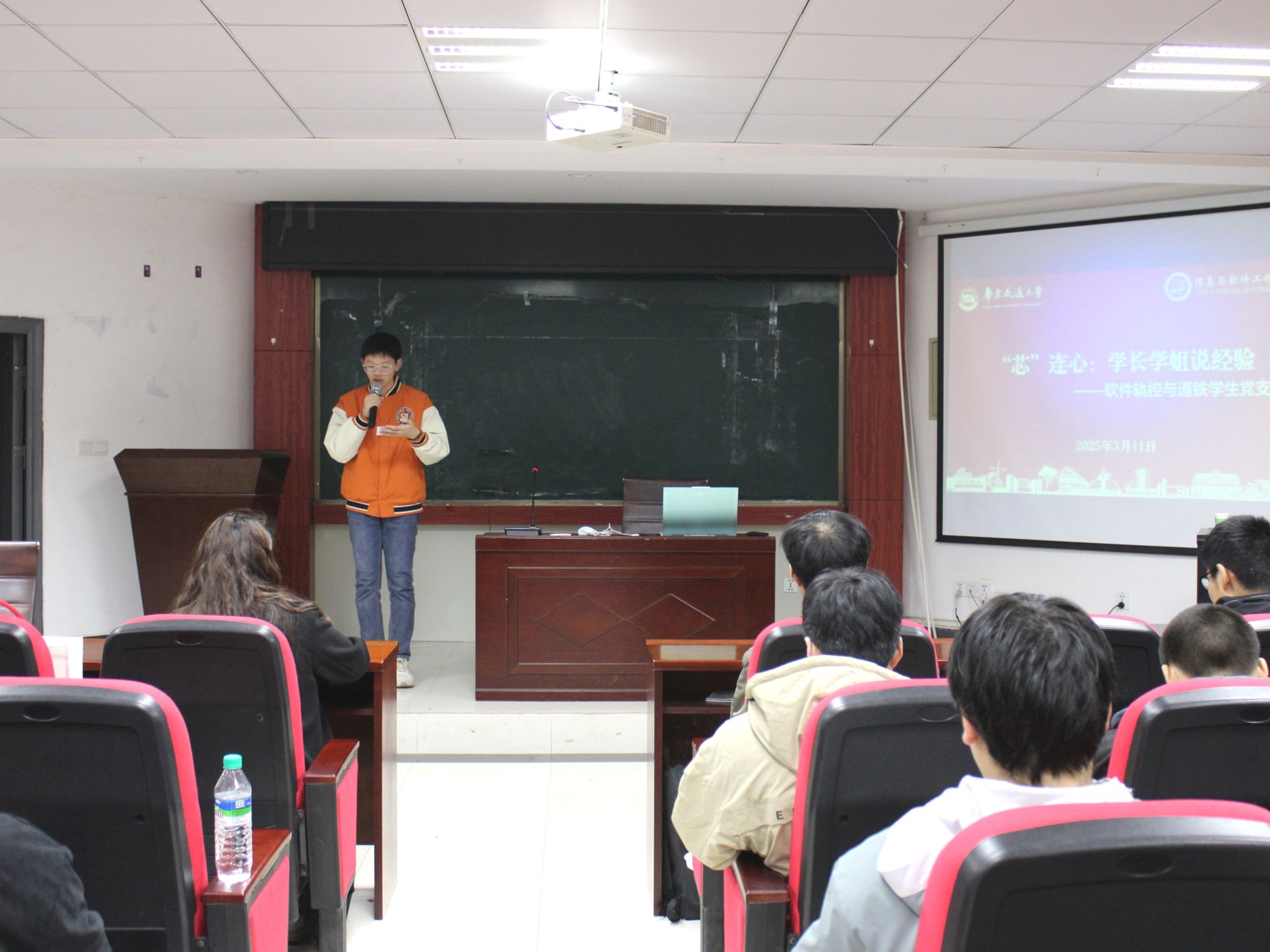 “芯”火辅导员工作室与软件轨控与道铁学生党支部在北区35栋一楼报告厅联合举办了“‘芯’连心:学长学姐说经验”主题活动。本次活动由24级人工智能2班副班长张沐曲主持,24级人工智能全体学生参与。