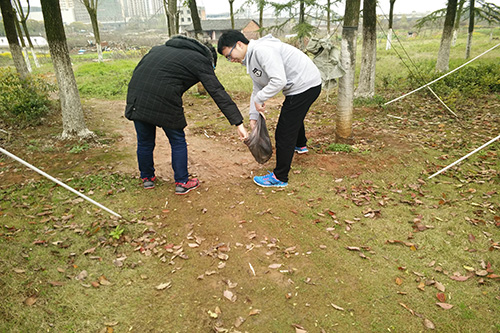 暖暖的阳光照在身上,在各班班长的带领下,同学们兵分五路热情高涨,自带环保垃圾袋等工具,重点清理艾溪湖旁边绿化带内及一些角落的白色垃圾,他们一手持垃圾钳、垃圾夹,一手拿垃圾袋,个个都像“寻宝”似的,不放过一个塑料瓶,一个烟蒂,认真地搜寻着隐藏在各处的垃圾。有的同学因工具不够,就直接把垃圾袋套在手上捡拾垃圾,每个同学都积极参与到活动中。