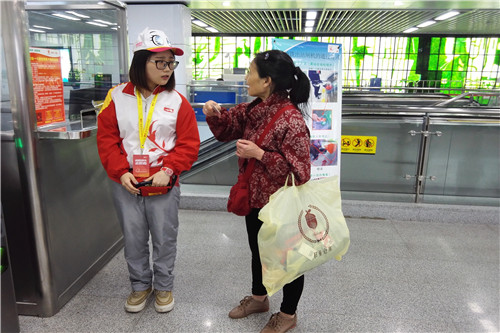 志愿者们分布于售票机、闸机和屏蔽门等处,指导乘客购票,维护站内秩序,引导市民有序进站乘车提高了地铁运营的效率,增强了乘客们的乘坐体验。“请问您打算去哪?”、“请站在白线后再刷卡”、“前往万达广场方向请在这边乘车”站在闸机处的志愿者细心为乘客们服务。此外,志愿者们还帮助地铁工作人员搬运铁码,数量达四十余个,搬运时间长达一个小时,他们的额头布满汗珠,气喘吁吁,认真负责的工作态度得到了工作人员的赞赏